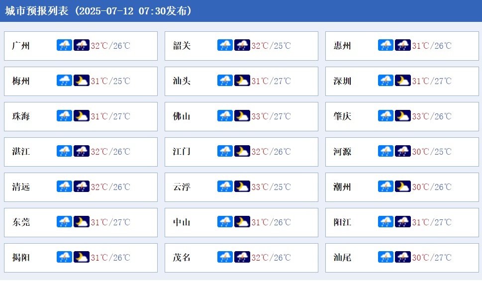 12日,珠江三角洲和粤西市县有分散的中到大雨局部暴雨,其余市县多云,有阵雨。最高气温:中北部市县31~34℃,其余市县29~31℃。